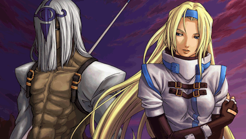 ...and how much I really wouldn't mind seeing a bit more of him. ^^; You might not know it, but I'd swear he's one of the biggest remaining mysteries in the game - there are all these weird hints about what he really is (and we're talking maybe even more unusual than Valentine here) that they don't quite get around to elaborating on, and it ends with Sol pretty much grabbing him before he can head off on his own in the ending sequence and saying 'you've got some explaining to do'. Only... in a relaxed sort of way XD. Izuna is like some kind of beautiful angst-free zone, *and* with one of the most refreshing attitudes to having to fight I've ever seen. ^__^